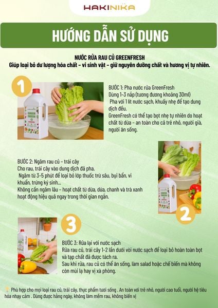 Chính từ những lo ngại đó, sản phẩm GreenFresh – Nước rửa rau củ chiết xuất từ thiên nhiên được giới thiệu như một giải pháp làm sạch chuyên sâu nhưng an toàn, lành tính – phù hợp với cả trẻ nhỏ, phụ nữ mang thai và người ăn chay.